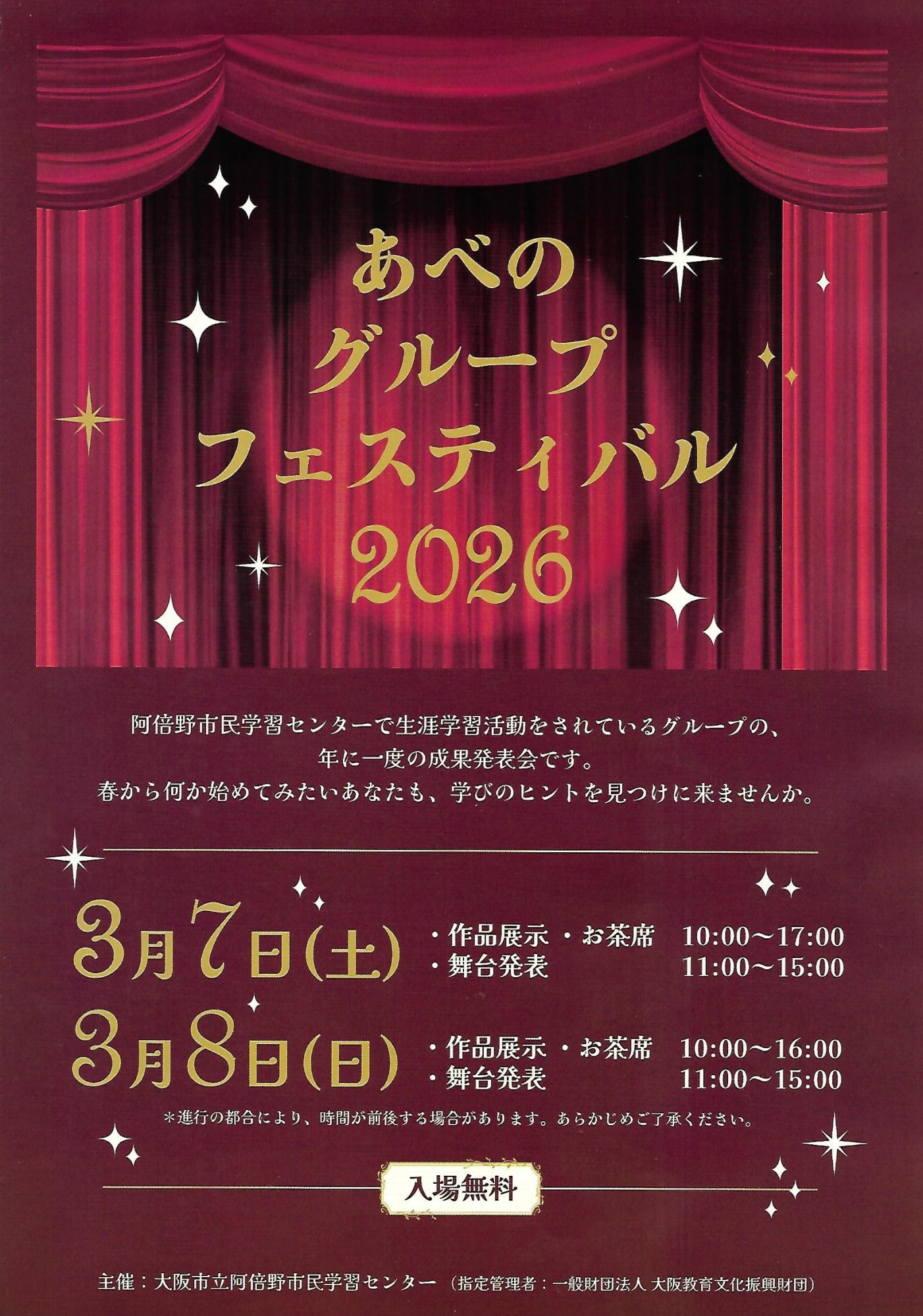 阿倍野市民学習センターで活動する様々な分野のグループが、日頃の学習の成果を発表します。