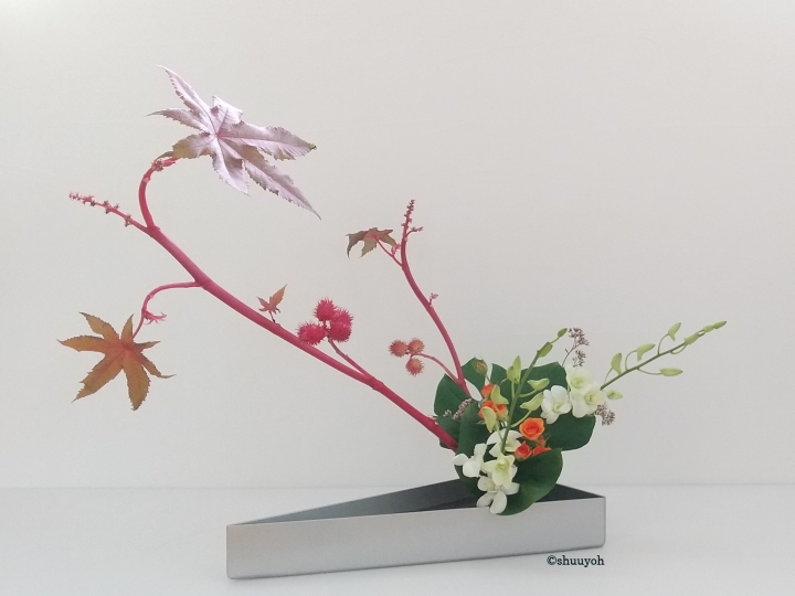 自宅で育てているスプレンゲリーの葉を足して、生け替えてみました。