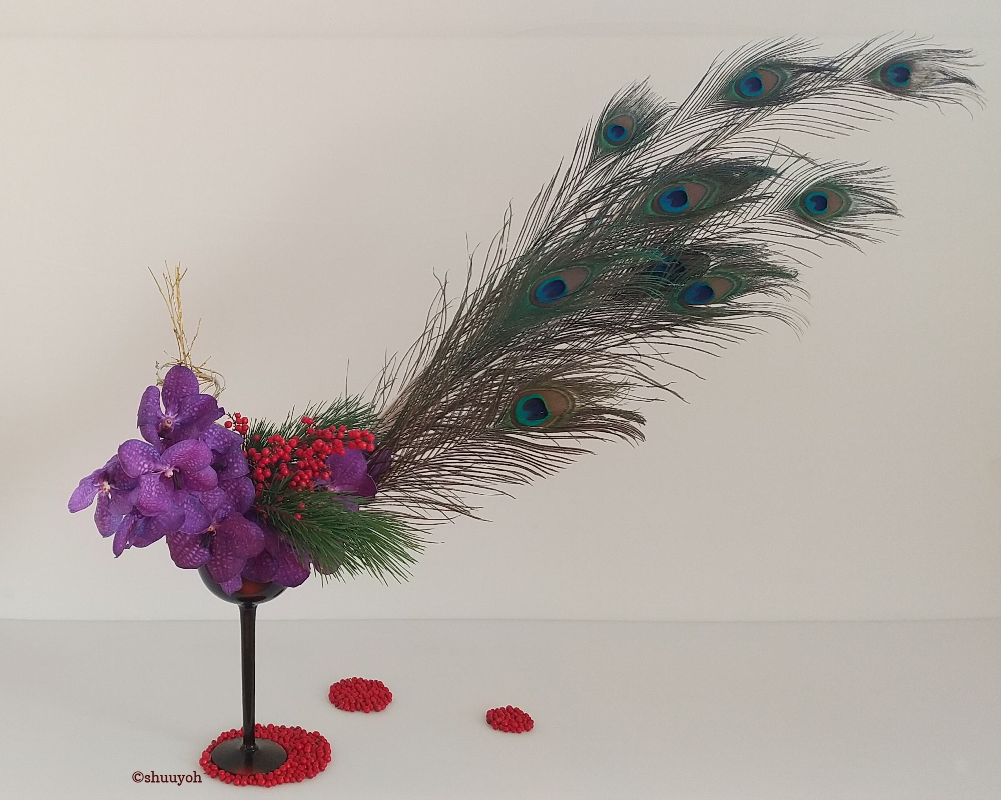 【お正月の創作いけばな】 ~孔雀~ 孔雀の羽根 バンダ 着色巻き竹 南天の実 小松